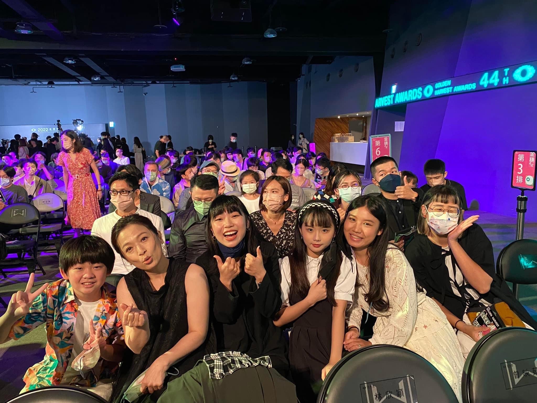 榮獲評審團特別獎的作品〈那天,我媽偷了老師的車〉,導演詹欣怡(左三)與甫獲金鐘獎女配角謝瓊煖(左二)及本屆金穗獎最佳演員獎鄭逸軒(左一)於頒獎典禮合影。