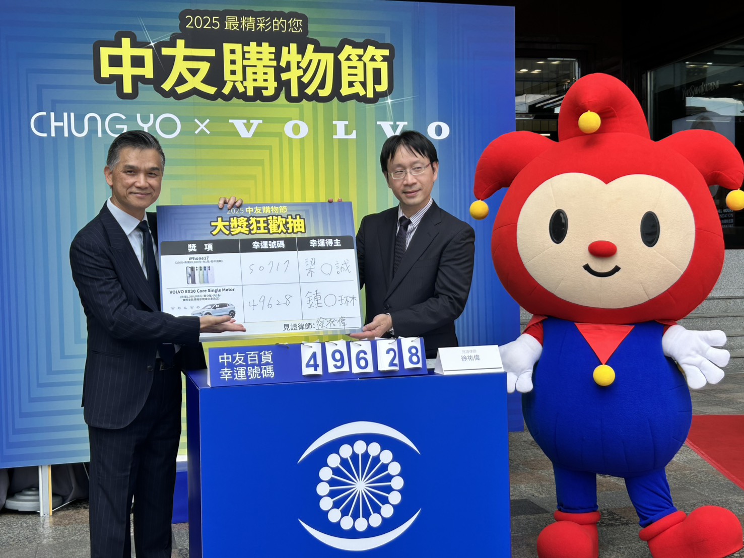 剛結束的中友購物節,於4日上午舉行壓軸大獎抽獎儀式,在中友法律顧問徐祐瑋律師及現場顧客的見證下,公開抽出VOLVO EX30豪華純電休旅車及iPhone 17手機等大獎,並同步於中友百貨官方粉絲專頁進行直播。