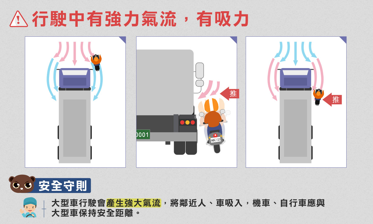 大型車行駛時產生的「推」、「吸」的強力氣流,會使騎士容易失去平衡、導致搖晃而發生危險。而大型車在交岔路口轉彎時因車身軸距較長,內輪差也較一般車輛為大(大貨車內輪差為3.5-4.5公尺;聯結車內輪差為6-7.5公尺),加上大型車駕駛座較高、車輛本身結構及裝載貨的關係,大型車的視野死角也較其他車種為大。