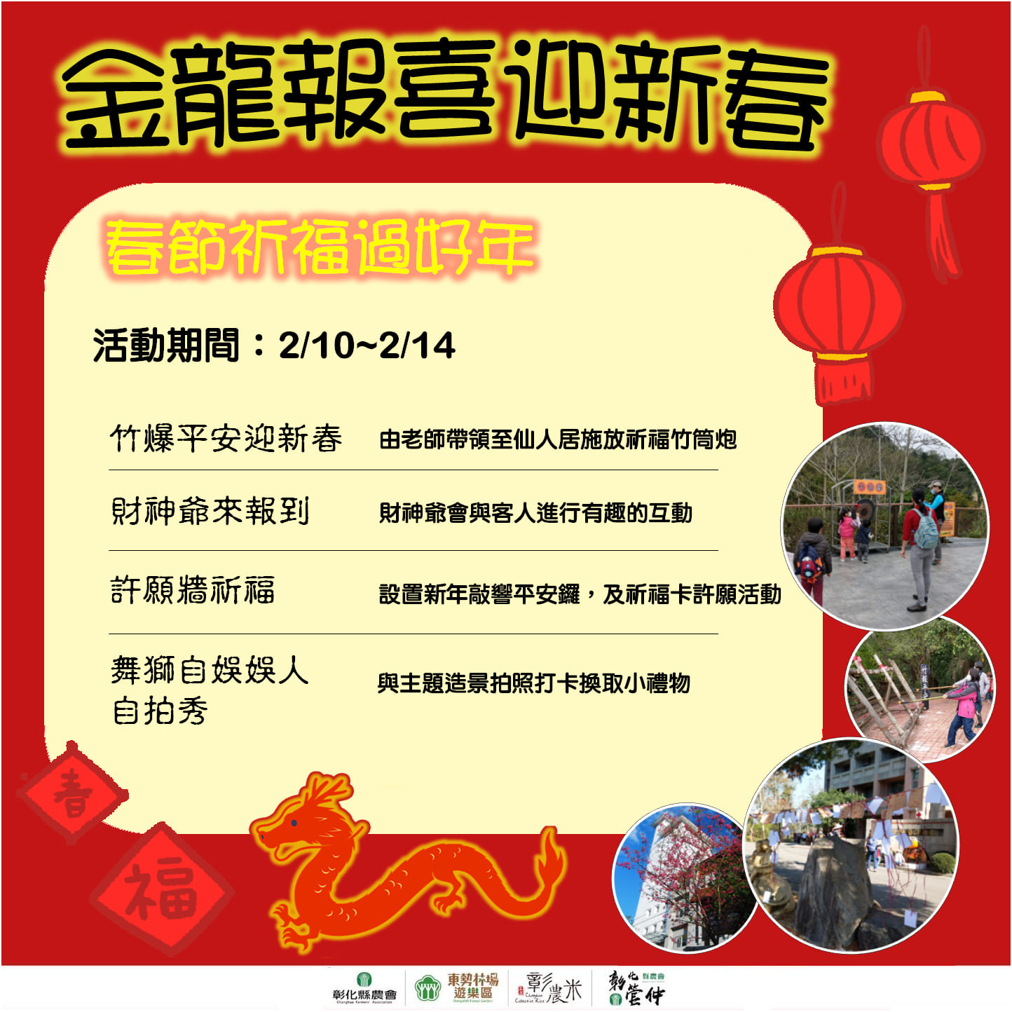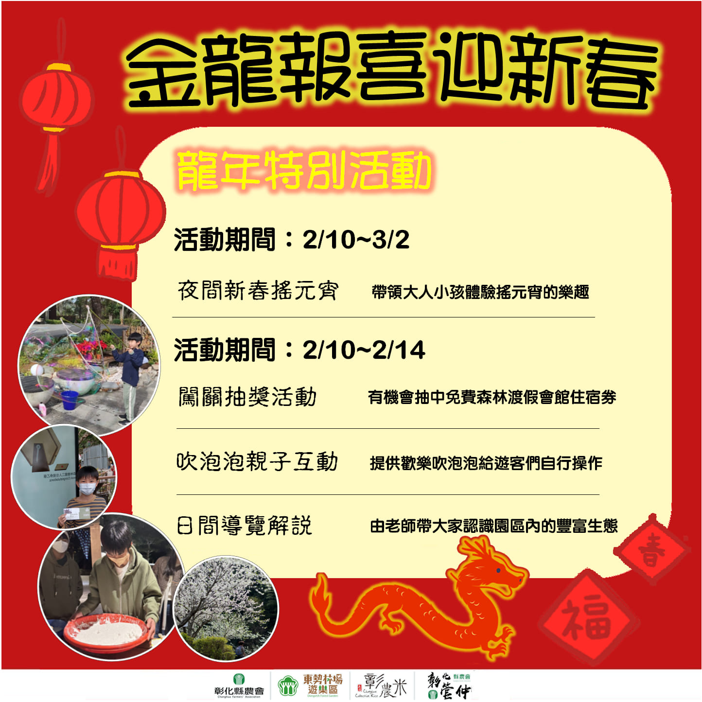 東勢林場遊樂區春節也推出了「金龍報喜迎新春」櫻花季系列活動,有趣味闖關遊戲、賞櫻導覽解說、放竹筒炮祈福活動、財神爺來報喜、吹泡泡親子互動戲等多種活動。而春節期間(初一至初五)也推出了「好運龍總來」闖關遊戲,只要憑入場購票的發票即可免費參加闖關活動,現場加入彰化管仲Line@還可以多一次闖關的機會,過關後現場就可以參加抽獎,獎品非常豐富,歡迎大家一起來同樂!