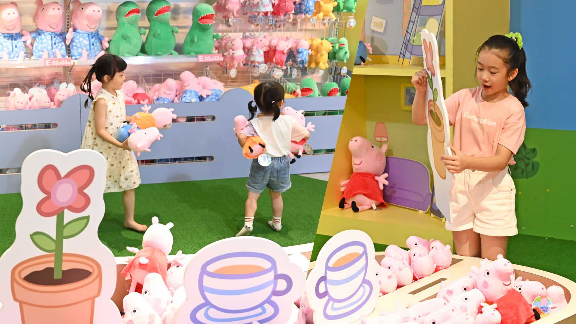 旗艦館從建築外觀上就展現出小巧思,有三眼怪漫步在玻璃櫥窗上,加上大型2D娃娃機展示,呈現可愛、療癒的主題形象,大門口也有KHTOY獨家推出的超萌恐龍造景以及超大型親子熊綠化植栽,要讓大家一開始就被可愛所統治!館內有三層樓,一樓共10大主題展區,包含迪士尼主題區、卡娜赫拉的小動物、天竺鼠車車、動漫房間、間諜家家酒、哥吉拉、哈利波特、粉紅豬小妹等,以大型玩偶搭配的互動式場景,搭配琳瑯滿目的商品陳列,保證讓你驚喜不斷 ; 二樓設有親子空間-小小雷克斯探險王國,大朋友在逛展購物的同時,能讓孩子在此區開心玩耍;三樓則是超大型絨毛玩偶的夢幻天地,陳列各品牌的完美大型玩伴,可愛又吸睛,無論是送禮或自用都超適合 !