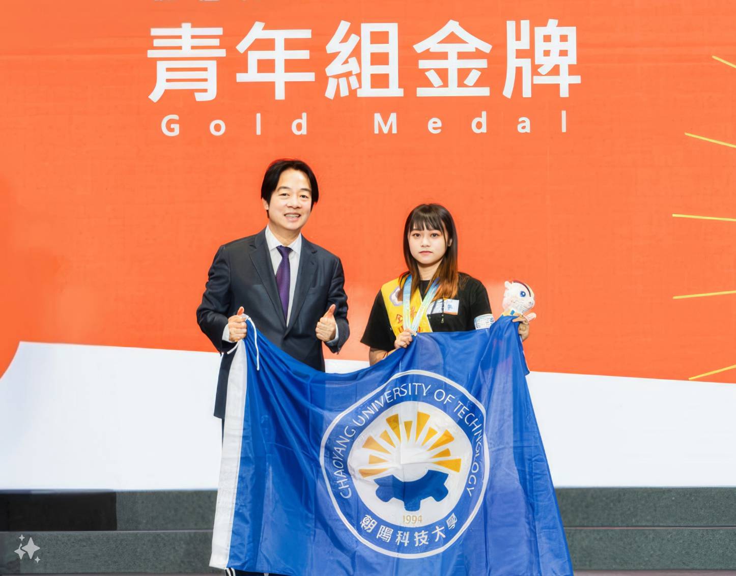 朝陽科大資管系學生陳奕璇(右)勇奪第54屆全國技能競賽3D數位遊戲藝術職類青年組金牌,接受賴清德總統(左)表揚。