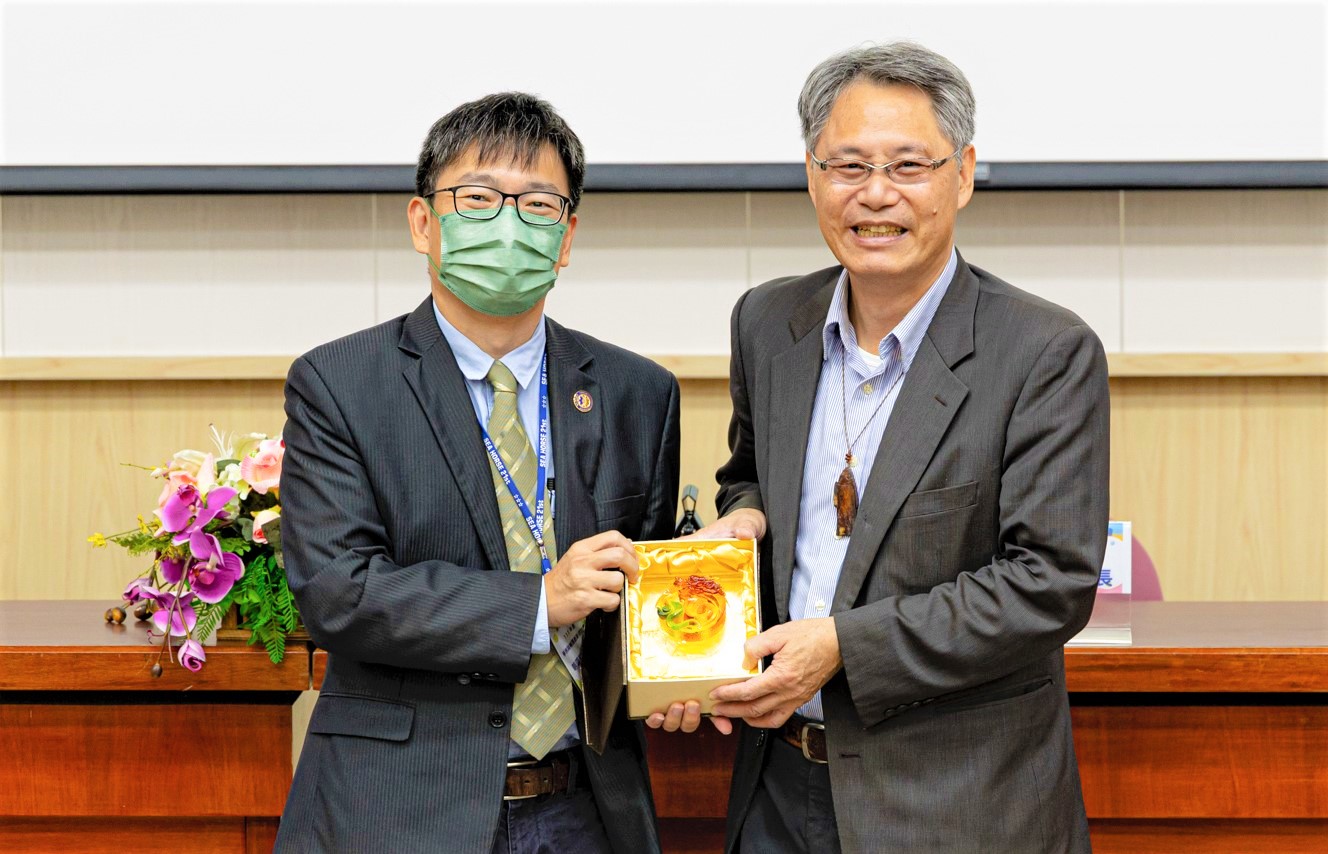 朝陽科大學務長廖俊鑑(左)特別感謝國立臺灣交響樂團團長劉玄詠(右)蒞校專題演講,分享實踐在地關懷之成果。