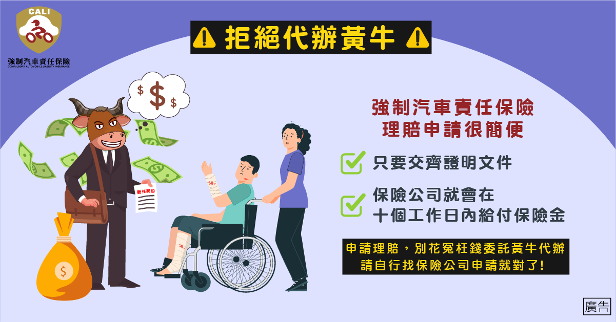 政府為使汽車交通事故所致傷害或死亡之受害人,能迅速獲得基本保障,並維護道路交通安全,依法所有車主都必須投保。代辦黃牛常利用“資訊落差”或“特殊管道”騙取民眾,申請保險金或補償金手續其實很簡單,根本不必花錢找人代辦。