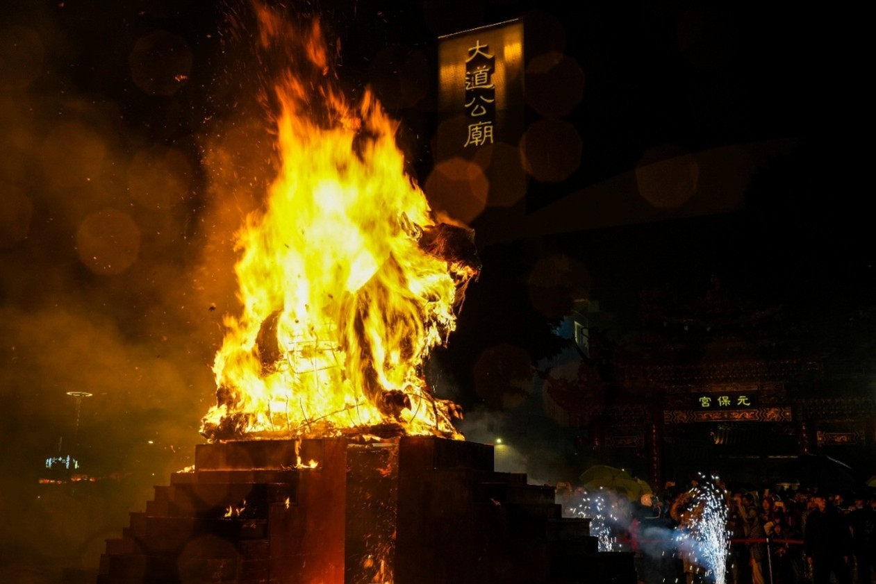 今年火獅造型再升級,特別換上量身打造的流蘇獅衣,隨著步伐擺動更顯威風凜凜。高9尺的巨型火獅依循古禮紮製而成;在眾人虔誠祈願聲中點燃火獅,熊熊烈焰直衝天際,瞬間照亮夜空,象徵去除瘴癘之氣、祈求新的一年平安健康,吉時一到火獅在眾人驚呼聲中點燃、熊熊烈焰瞬間照亮夜空,展現傳統信仰的磅礴氣勢。