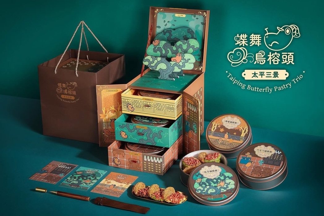 包裝設計同樣成為本次評選關注亮點之一。禮盒採三層抽屜式結構,分別對應太平三景,內容包含三款插畫圓鐵盒蝴蝶酥、三張景點插畫明信片,以及一支黃銅花梨木筆,鼓勵消費者透過書寫與收藏延續地方記憶。整體包裝以「不被丟棄」為設計核心,選用環保大豆油墨印刷,並強調盒體與配件的再利用性,實踐貼近日常生活的永續設計理念。
