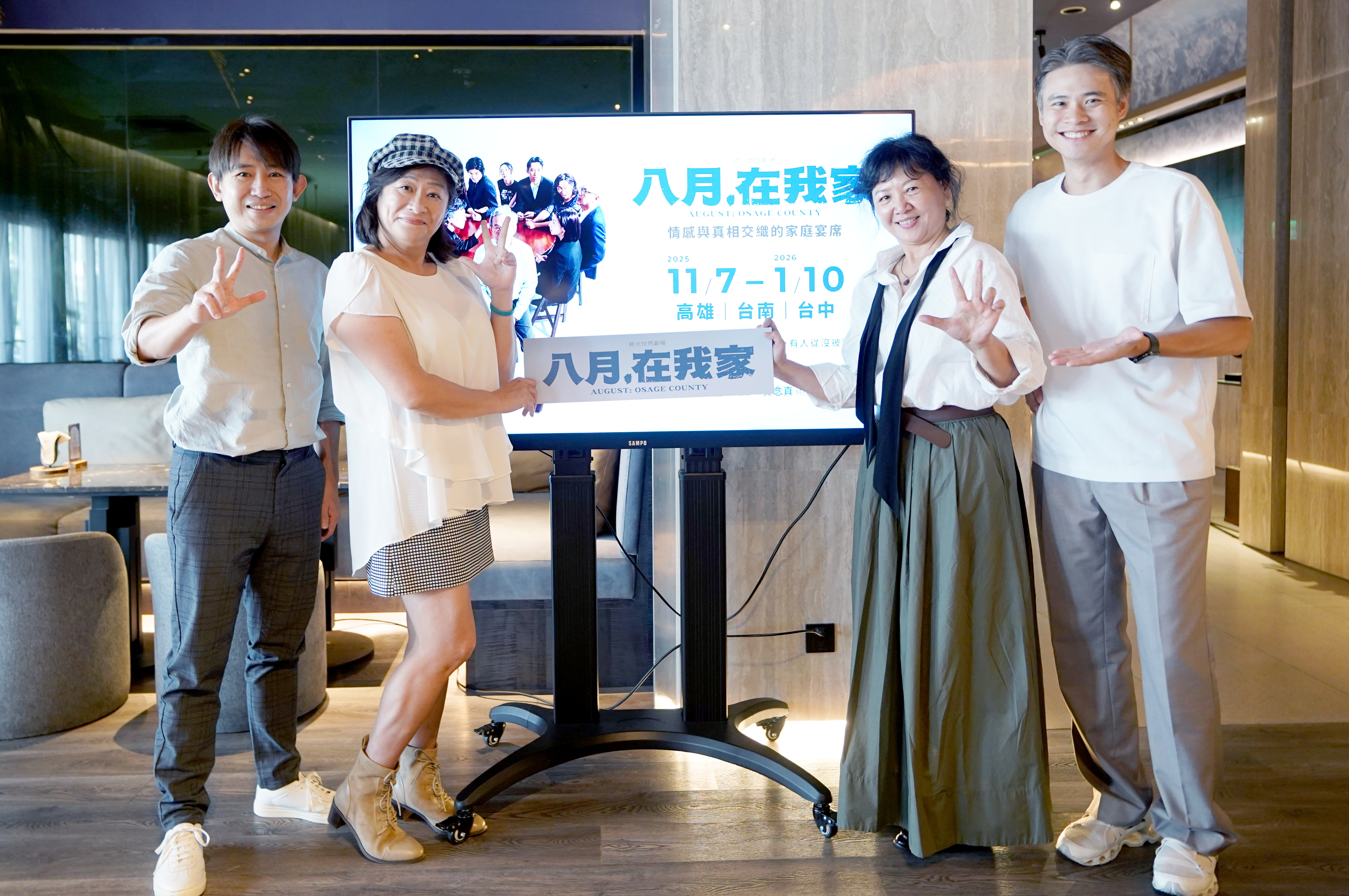 《八月,在我家》導演 吳定謙(右)、演員 王琄(右2)、張丹瑋(左2)、劇本翻譯 吳政翰(左1)今出席高雄記者會宣傳11月7~9於衛武營的演出。(綠光創藝提供,張大魯攝影)