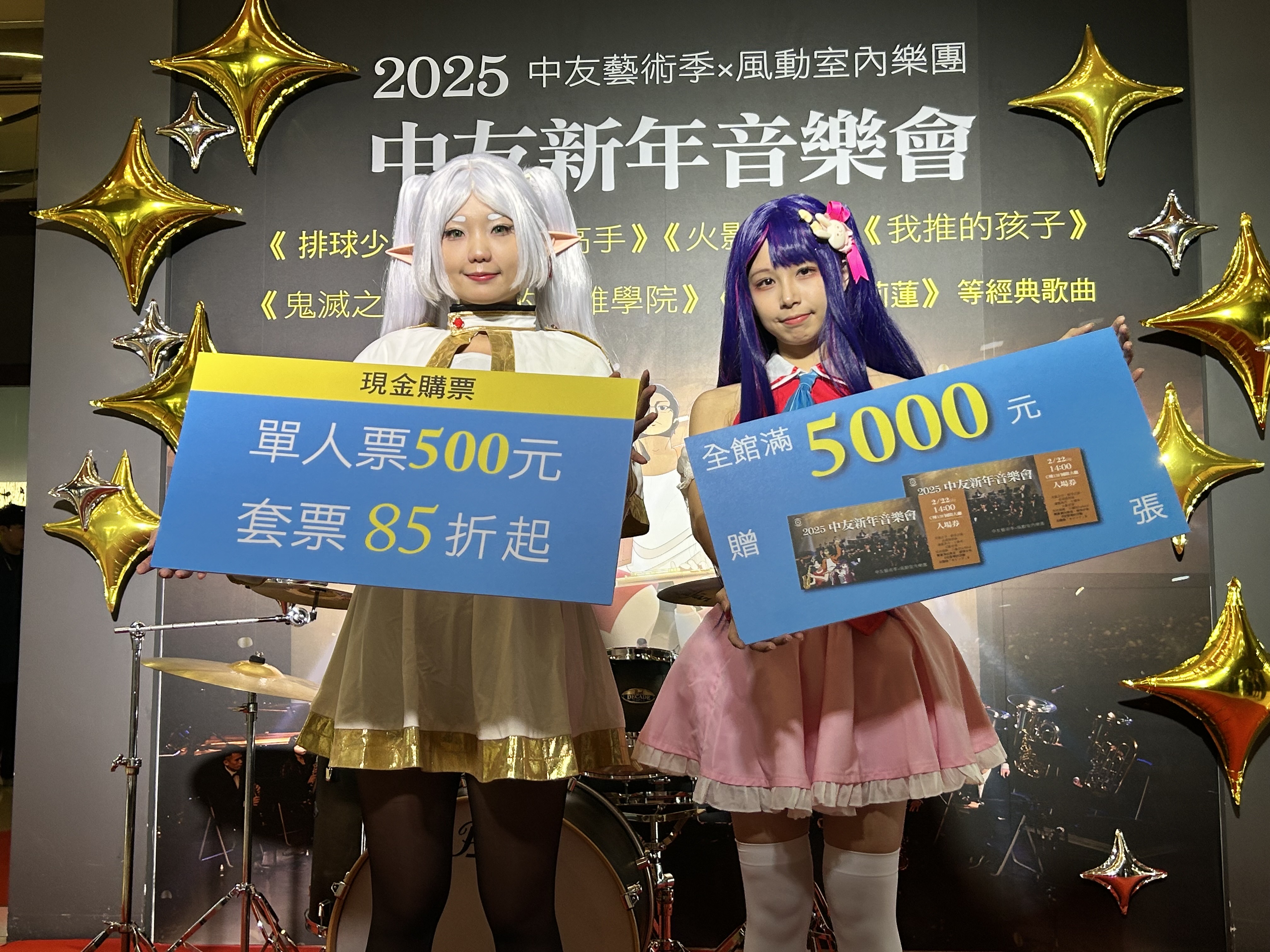 中友藝術季將於2月22日展開2天共4場的演出,由風動室內樂團帶來17首高規格曲目,有名偵探柯南、灌籃高手、七龍珠、火影忍者、進擊的巨人、航海王、鬼滅之刃、我推的孩子、葬送的芙莉蓮…等等,2月23日場次特別邀請療癒系歌手解偉苓演唱,33人大編制旋律悠揚、氣勢磅礡,以震撼人心的演奏開啟新年新篇章!即日起開始贈售票,可至中友百貨及年代售票系統購票,單人票500元、2人套票9折、4人套票85折;活動期間持中友APP於百貨店內當日消費累積滿5000元,可獲贈票券2張,每日每ID限贈4張,贈完為止。演出當天邀請動漫Coser開場走秀與粉絲近距離互動,還有票選最愛曲目抽動漫福袋以及觀劇加碼送好禮等多項活動,詳情請洽中友官方網站以及中友APP查詢。