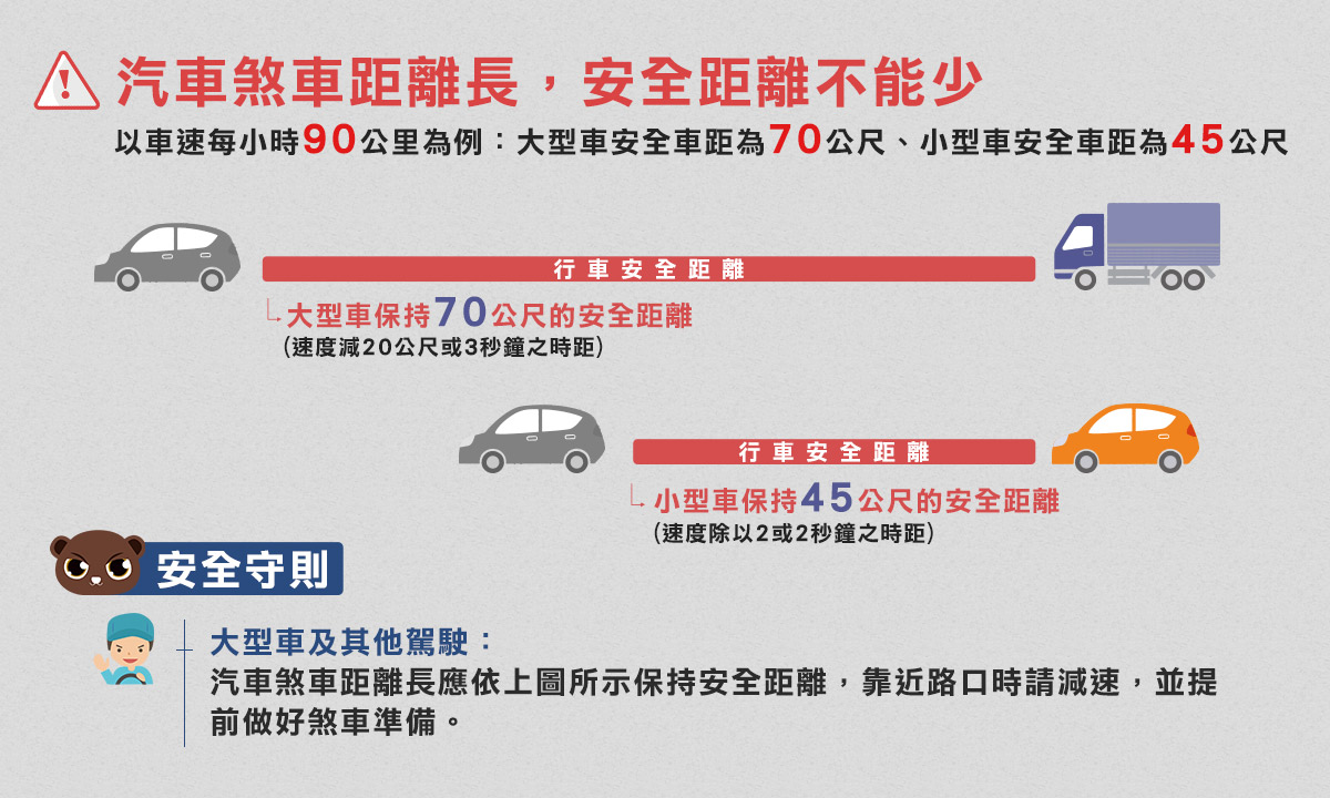 大型車在交岔路口轉彎時因車身軸距較長,內輪差也較一般車輛為大(大貨車內輪差為3.5-4.5公尺;聯結車內輪差為6-7.5公尺),加上大型車因車輛本身結構及裝載貨的關係,大型車的視野死角也較其他車種為多。遇到大型車過彎時,建議停在大型車後輪之後,等大型車完全過彎後,確認安全再繼續行駛,才能確保平安。