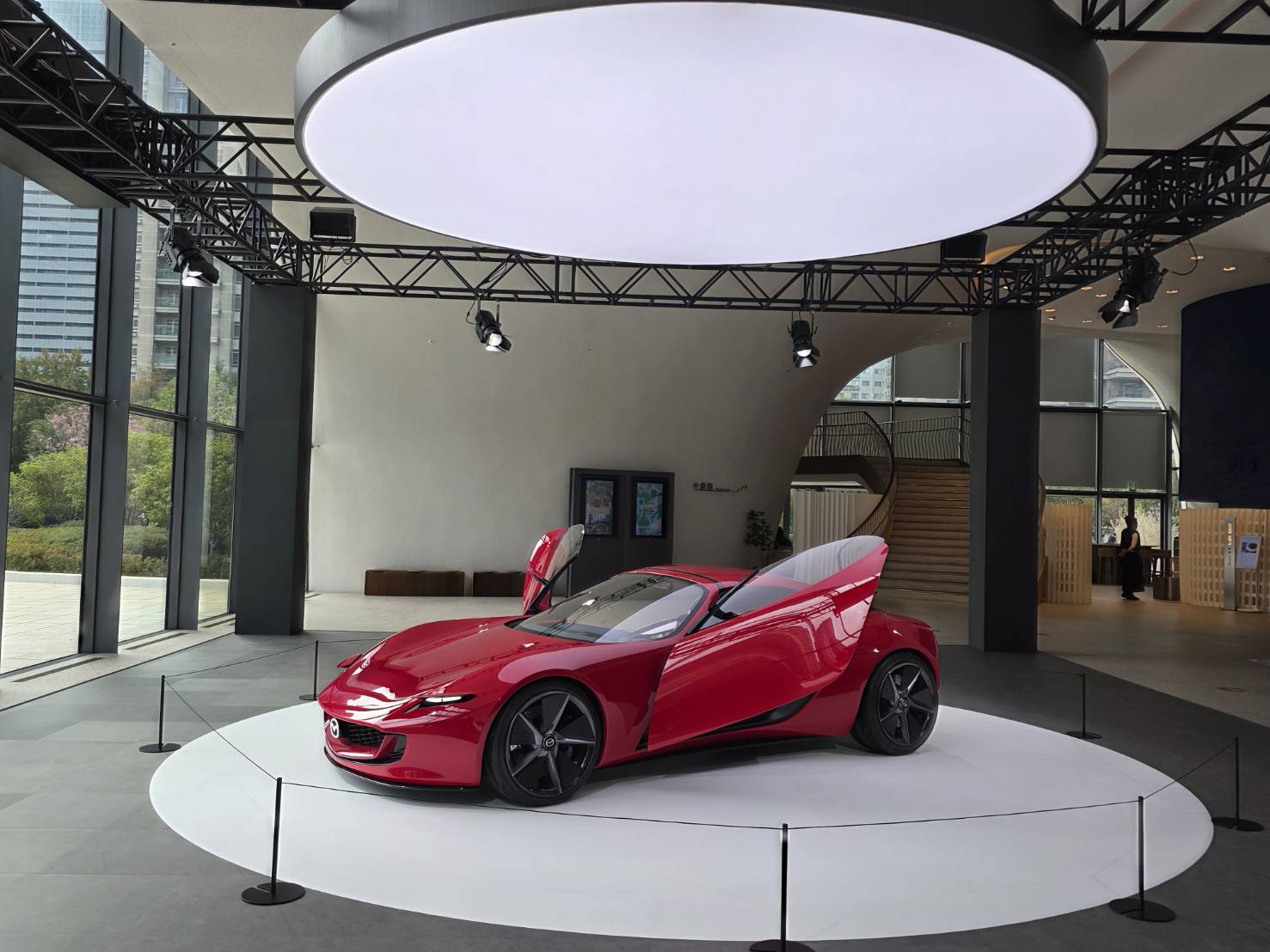 台中,匯聚了眾多普立茲克獎大師經典之作,天際線宛如國際建築美學的展演櫥窗,在這片建築群中,臺中國家歌劇院以挑戰世界建造難度之最的結構奇蹟,確立了其難以企及的地位。由伊東豊雄大師親手擘劃,以無樑柱曲牆工法打破建築內外界線,透過仿生呼吸孔讓光影在空間中自由流動,同時結合輻射傳導冷卻地板的節能智慧空調設計,體現與自然共生的理念。這份對光影流動與永續願景的追求,恰與 MAZDA ICONIC SP 概念跑車形成完美呼應——歷經 27 層塗層工藝打造的「紫羅蘭紅」專屬車色,在歌劇院流動的光影映照下,演繹出深邃且多變的視覺層次;而車輛採用的多元環保能源轉子發電技術與使用複合再生材質的座艙,則與歌劇院的節能設計理念不謀而合,譜寫出人與自然和諧共生的未來篇章。