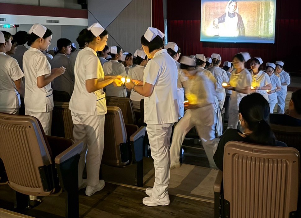 典禮除了國立暨南國際大學武東星校長、護理暨健康福祉學院陳建良院長、護理學系張素嫻主任出席外,也榮幸邀請到多位醫界人士蒞臨指導,包括埔里基督教醫院董事長趙文崇、院長蘇世強,彰化基督教醫院護理部主任李雅文,以及台中榮總埔里分院護理部副主任蔡佳慧、助理護理長施玟瑩等。護理系師長親手為學生加冠,並進行傳光儀式,寓意專業知識與人文關懷的傳承。隨後,全體學生莊嚴宣讀南丁格爾誓言,場面感人。