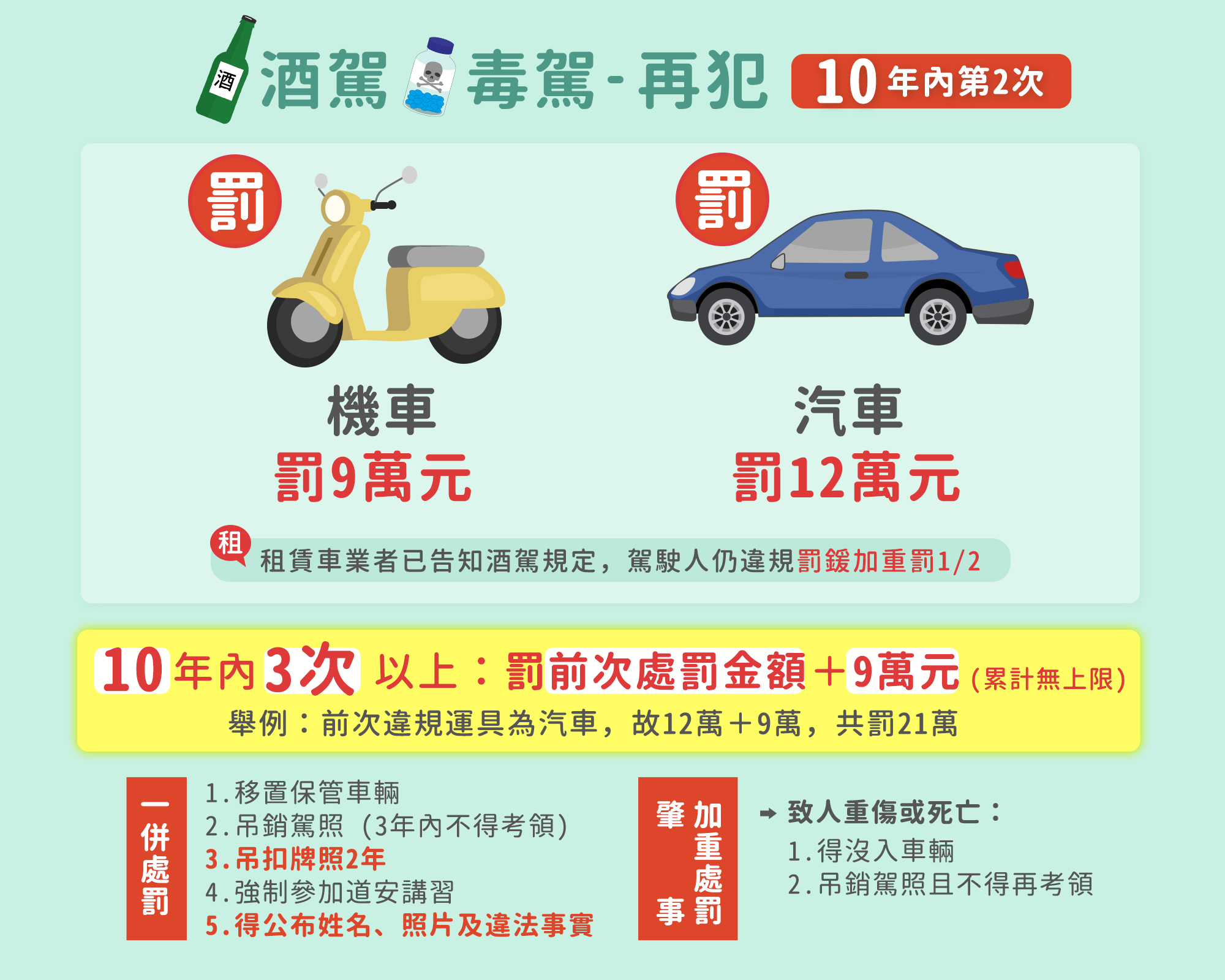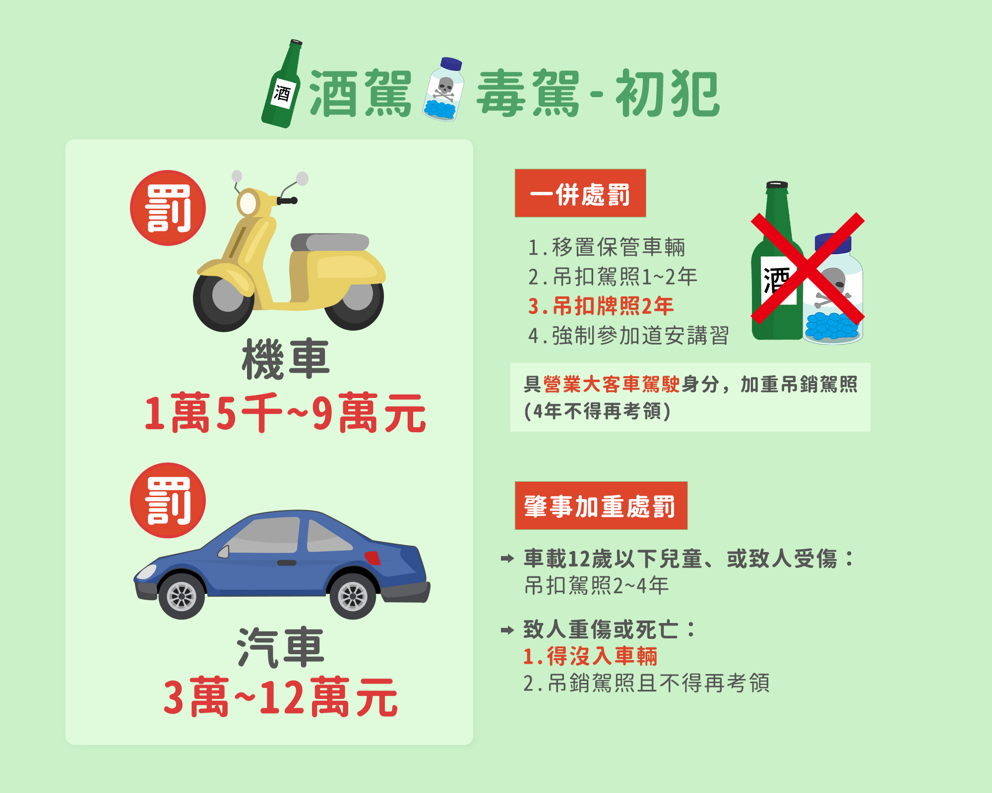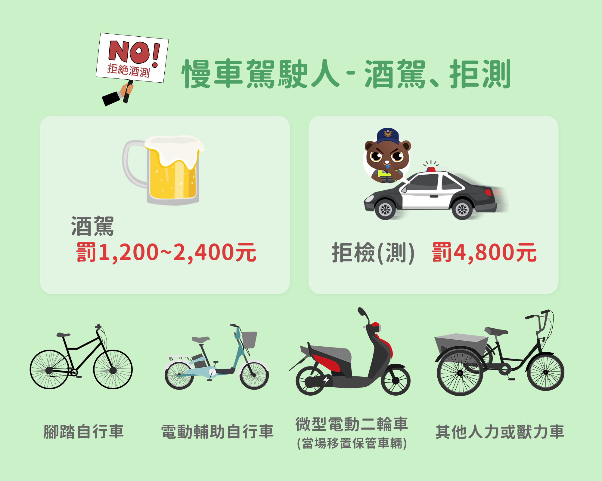 酒駕是極具危險性的違法行為,不僅會嚴重影響駕駛人的反應速度、肢體協調能力與專注力,更會導致判斷力下降,增加交通事故發生的風險。尤其當車輛前方出現突發狀況時,酒後駕駛所需的反應時間會顯著增加,常常來不及作出適當的避險或煞車動作,釀成無法挽回的傷害。且酒精攝取越多,反應速度越慢,風險也隨之升高。無論是開車、騎乘機車、自行車、電動輔助自行車,甚至是微型電動二輪車,只要酒後上路,皆屬違法行為。