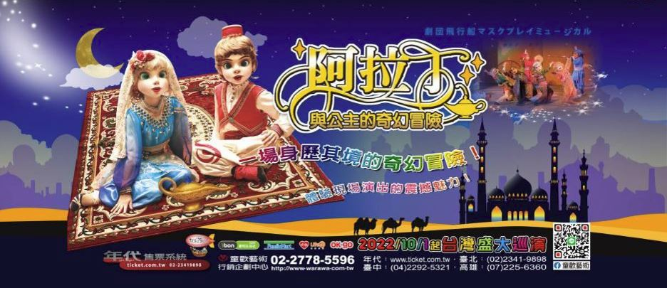 日本飛行船劇團睽違已久的55周年創新鉅作《阿拉丁與公主的奇幻冒險》於10月1日起在台灣展開巡迴演出!本劇改編自阿拉伯文學名著《一千零一夜》的不朽神話【阿拉丁(Aladdin)】,融合音樂、美術、舞蹈等藝術,以燈光布景道具結合科技投影特效作出令人驚艷的奇幻景象,帶來絢麗的視覺震撼!一盞能讓人美夢成真的古老神燈、翱翔天際的魔毯、美輪美奐的王宮以及無邊際的沙漠王國,看阿拉丁與公主輕輕摩擦神燈後幻化出的精靈,邀請您與孩子一同走進劇場暢遊魔法世界,體驗現場演出的魅力!