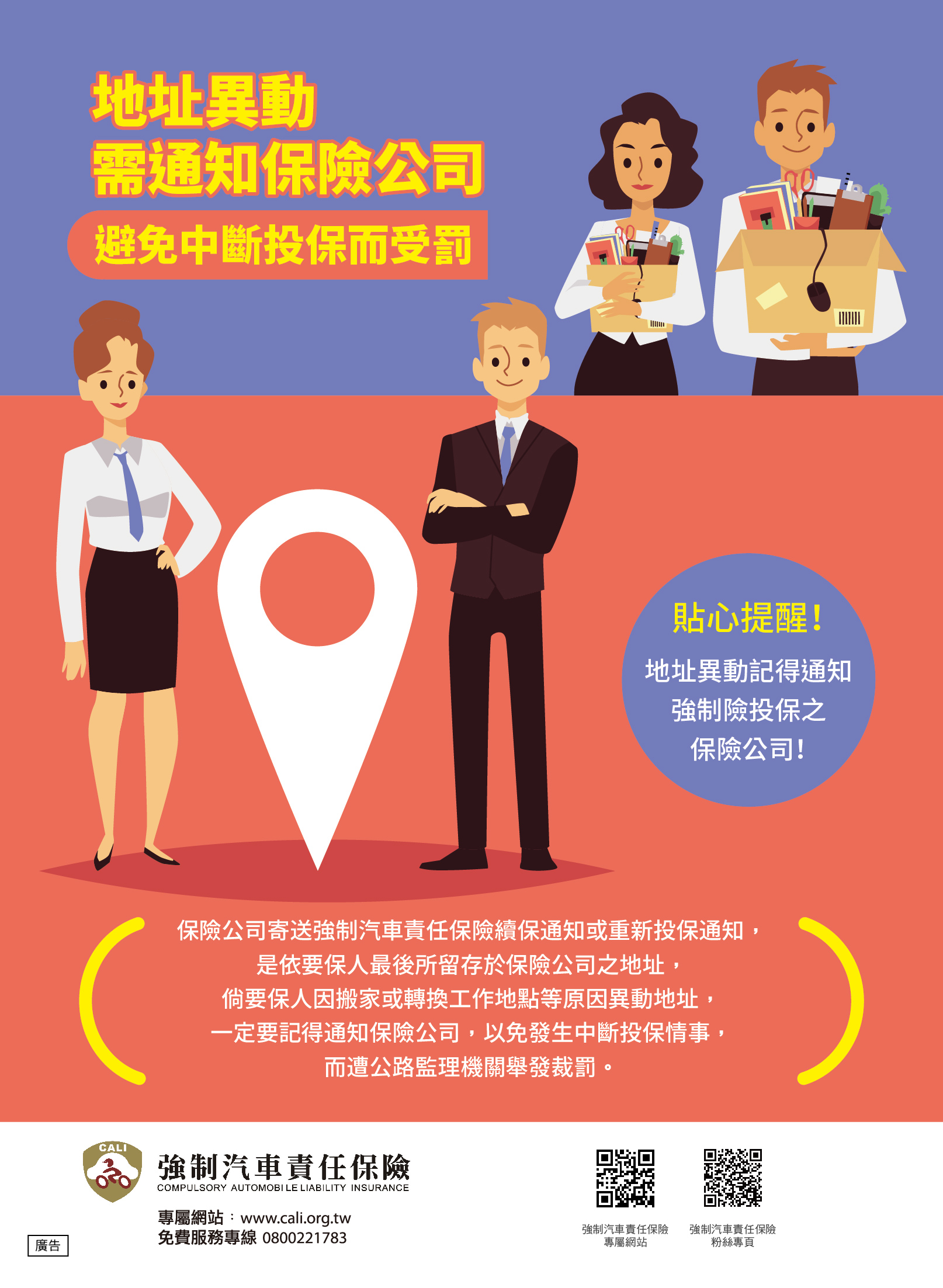 地址異動需通知保險公司,避免中斷投保而受罰! 保險公司寄送強制汽車責任保險續保通知或重新投保通知,是依要保人最後所留存於保險公司之地址,倘要保人因搬家或轉換工作地點等原因異動地址,一定要記得以書面通知保險公司,以免發生中斷投保情事,而遭公路監理機關舉發裁罰。