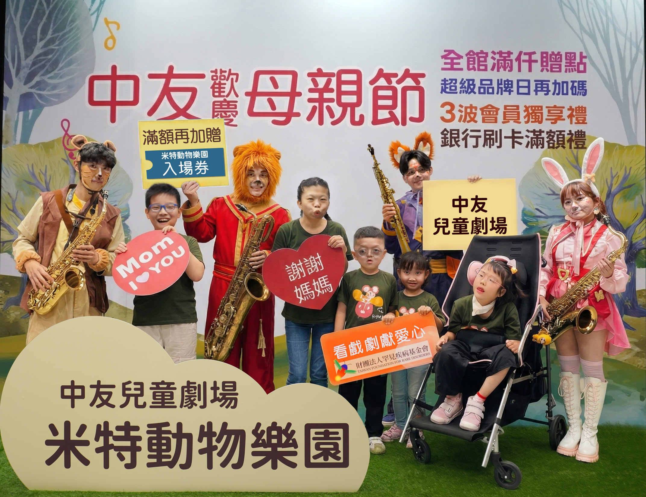 中部百貨母親節檔期戰火全面引爆!中友百貨今年母親節檔期(4月16日至5月11日)有全館滿千送百、超級品牌日加碼贈以及三波會員獨享禮、刷卡再加碼,透過有感的回饋與豐富的體驗內容,邀請消費者在購物之餘,更能與家人共度充滿溫度與記憶點的節慶時光。每年顧客最期待的活動還有中友兒童劇場,主打消費滿額免費贈票,今年特別與入選「台灣TOP演藝團隊」的米特動物樂園,推出全新劇碼「薩克歷險記 森林動物派對」親子音樂劇。這場結合薩克斯風、打擊樂與戲劇的跨界演出,引導孩子在歡笑中學習勇氣與合作。活動期間當日累積消費滿3,000元即可免費兌換演出票券一張。值得一提的是,向來熱心公益的中友百貨將售票收入10%捐贈財團法人罕見疾病基金會,並邀請30位基金會孩童入場觀劇,讓這場親子音樂劇更具意義。