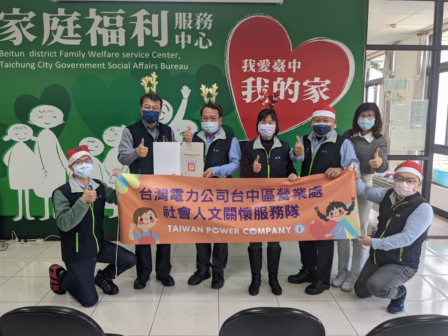 時值歲末年終,台電公司中部地區各單位秉持「主動理解地方鄉親、環境與社會的需要,以人文關懷、綠色永續、利他共榮」的態度,善盡企業社會責任,進行了許多地方性的寒冬送暖活動;以台電台中區處為例,已連續六年與台中市社會局合作,於冬至節令前夕,致贈弱勢家庭慰問金,更年年貼心準備熱騰騰、暖呼呼,象徵幸福、圓滿的湯圓,邀請受捐助的弱勢民眾一同享用;台中電廠自2013年起即每年辦理「社區環境教育~緣來一家親,關懷教育文化種苗活動」,提供新移民子女及低收家庭學童多元學習管道,培養第二專長,更與龍井區龍港、龍津及龍泉三所國小合作辦理課後才藝課程,開拓學童多元學習觸角,讓孩子建立信心、肯定自我;多年下來,學童無論是在書法、美術、音樂甚至是動畫創作上都屢創佳績,獲得多項大獎。台中供電區營運處的同仁更是發揮愛心不遺餘力,接連前往「私立惠明盲校」、「聖若瑟天主堂」及「僑榮國小攜手班」等各單位,鼓勵弱勢學童積極向學。中區施工處同仁也連續15年響應「台灣家扶基金會扶助貧童計畫」,從未間斷。