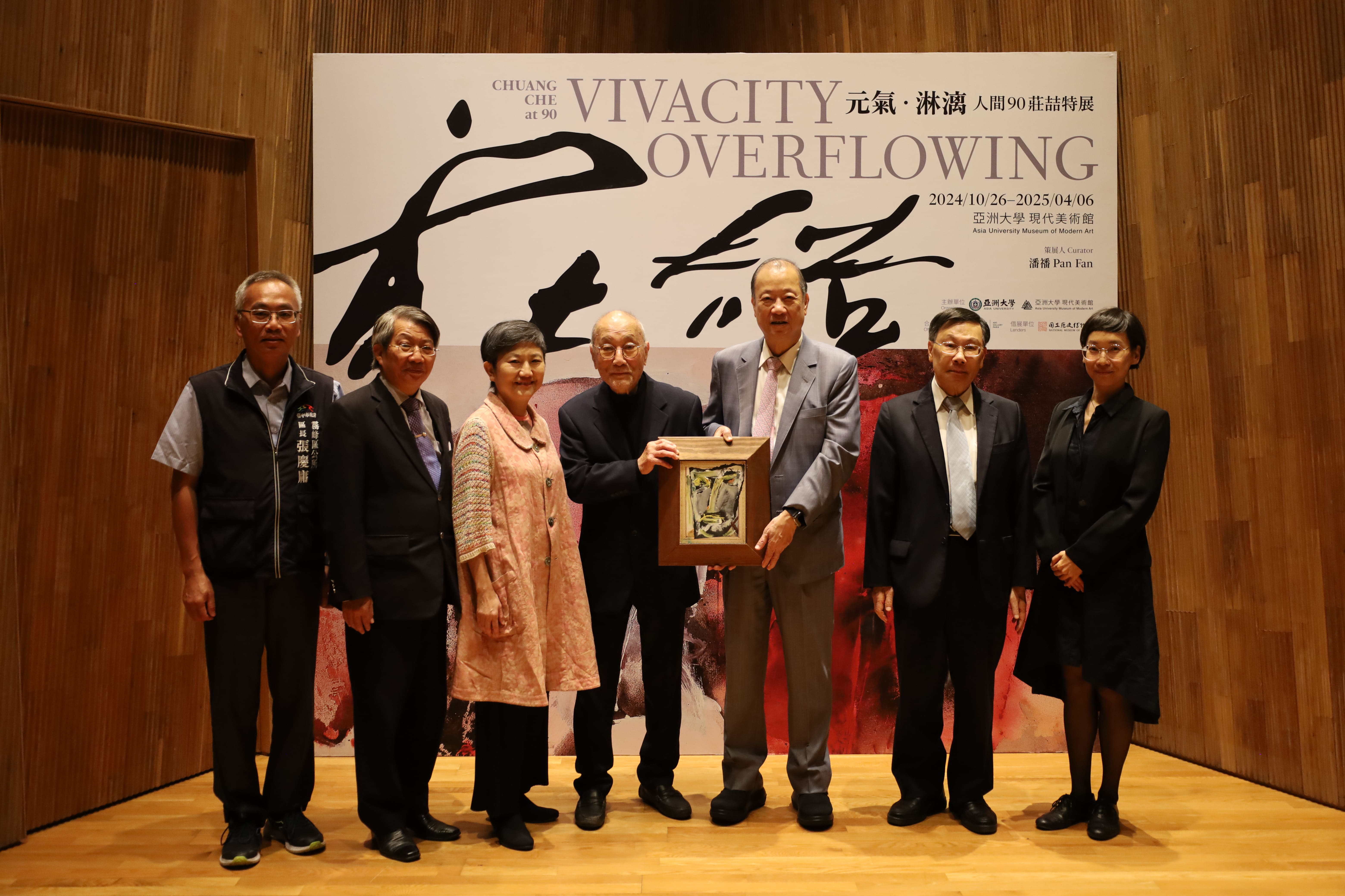 亞大現代美術館「元氣‧淋漓——人間90莊喆特展」開幕,莊喆大師(右4)、亞大創辦人蔡長海(右3)、亞大校長蔡進發(右2)等合影。