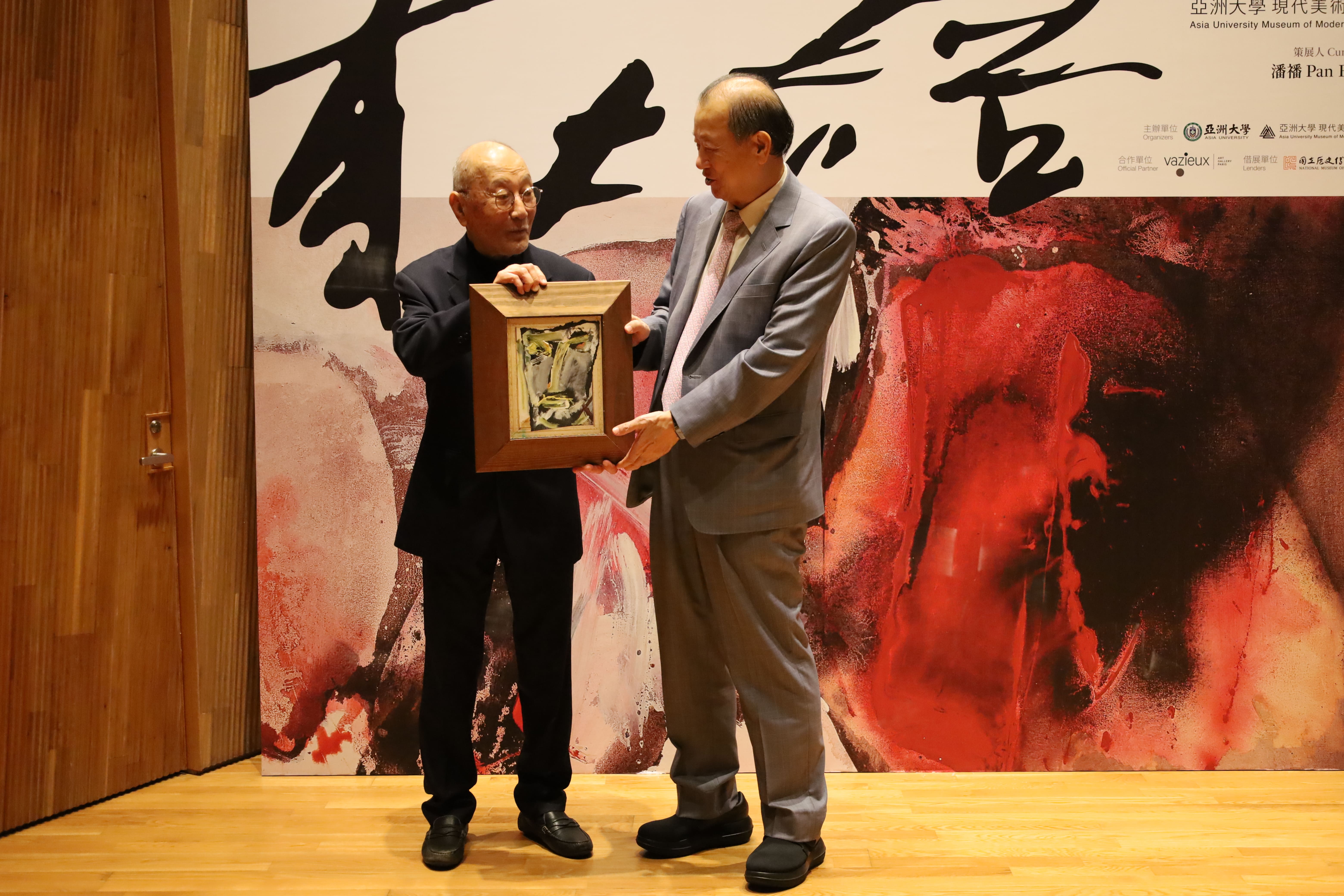 莊喆大師(左),捐贈12幅《臉相》系列作品,由亞大創辦人蔡長海(右)代表接受。