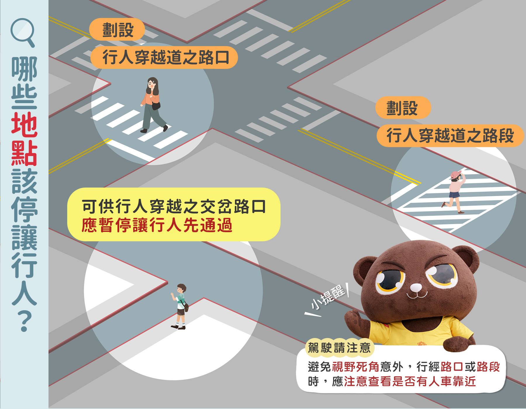 駕駛人在行經行人穿越道時,請保持車頭距離斑馬線上行人3公尺或3條枕木紋的距離暫停讓行人先行通過,以免發生事故;行人雖然有路權優先,但仍須遵守法規,如果是因行人未遵守規定,導致影響用路安全、肇事,那麼行人也必須負擔肇責。