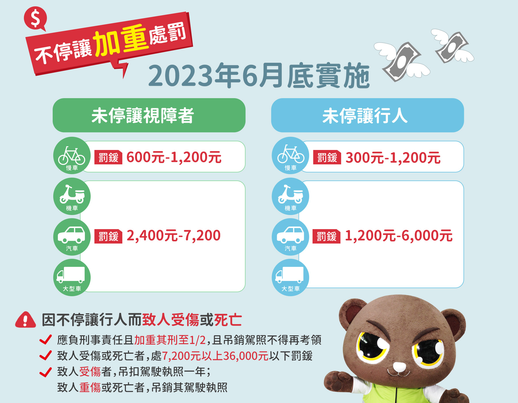 對於未停讓行人違規,依據「道路交通管理處罰條例」規定,汽車駕駛人駕駛汽車行近行人穿越道或其他依法可供行人穿越之交岔路口,有行人穿越時,不暫停讓行人先行通過者,加重處罰至6,000元,除罰款外,另外還要記違規點數3點及參加道路交通安全講習3小時。